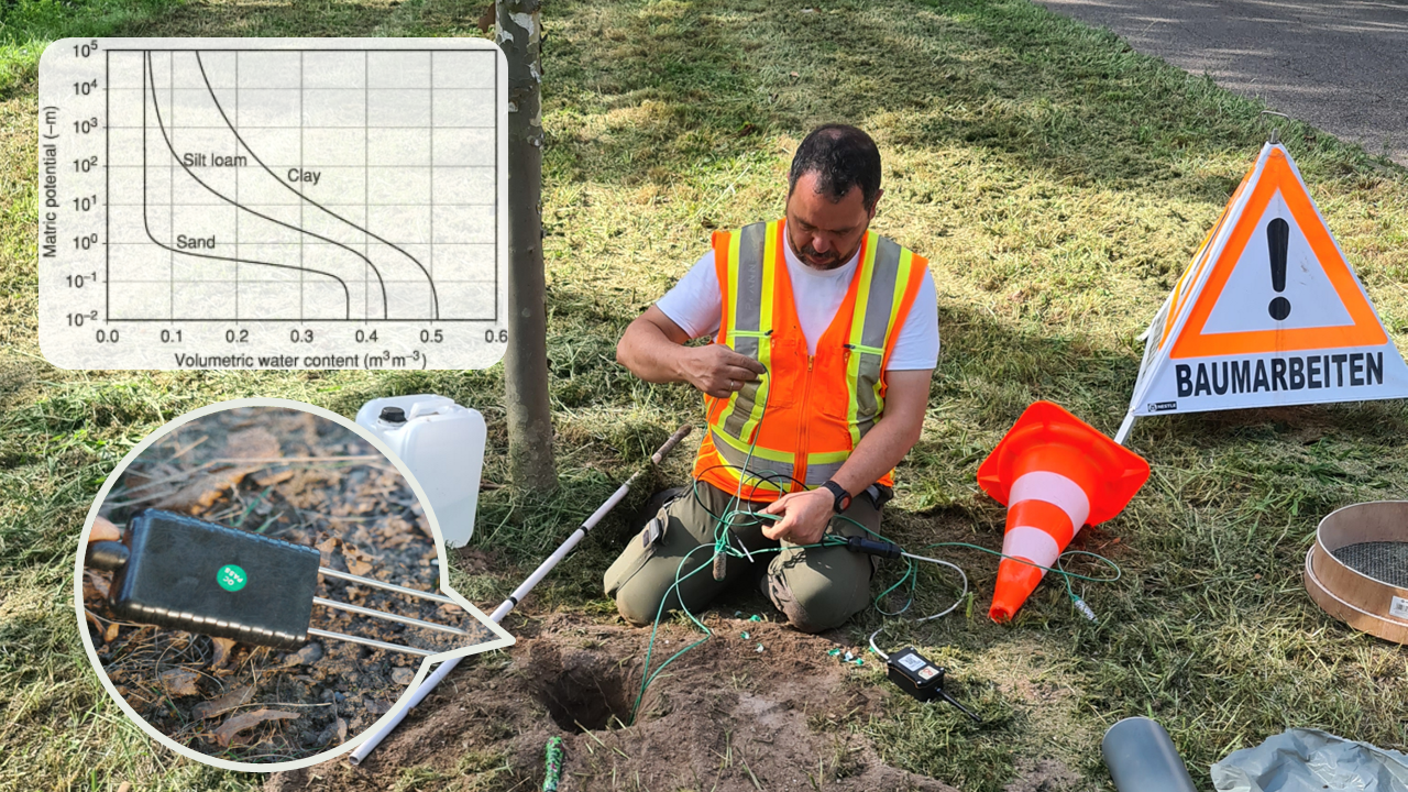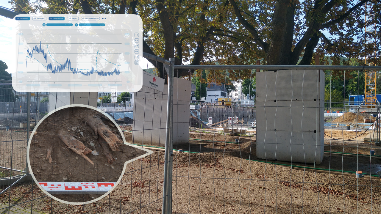 Die Vitalität von Bäumen am Rand von Baugruben wird durch den Einsatz von Baum- und Bodensensorik überwacht. So kann im Anschluss beurteilt werden, wie gut die Bäume die Baggerarbeiten überstanden haben.