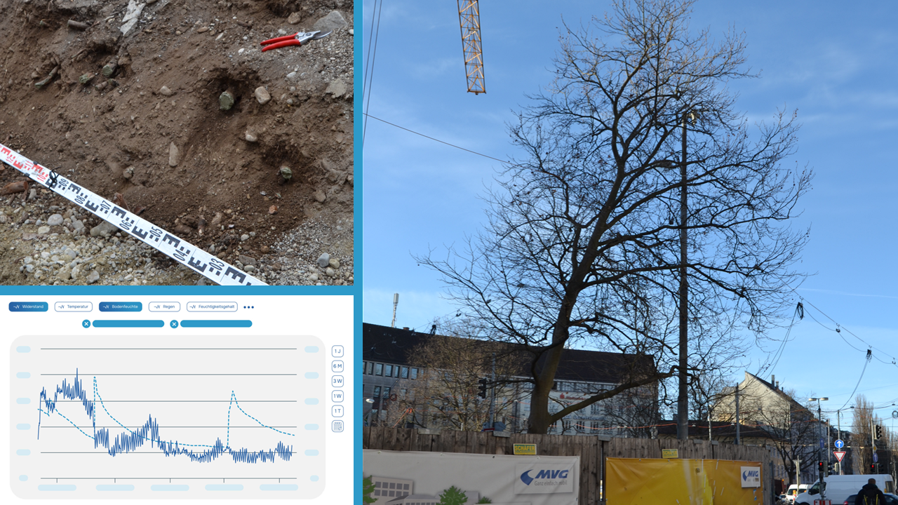 Die Vitalität von Bäumen am Rand von Baugruben wird durch den Einsatz von Baum- und Bodensensorik überwacht. So kann im Anschluss beurteilt werden, wie gut die Bäume die Baggerarbeiten überstanden haben.