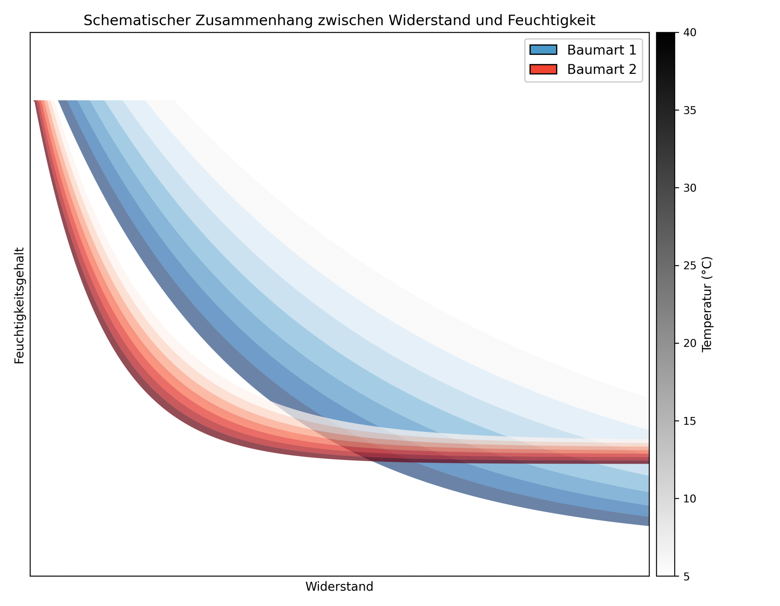 Der Plot zeigt qualitativ die Messpunkte, die während des Austrocknungsprozesses entstehen. Mit sinkendem Feuchtigkeitsgehalt des Aststücks (Austrocknungsprozess) steigen die gemessenen Widerstandswerte. Bei identischem Feuchtigkeitsgehalt ist der Widerstandswert bei höheren Temperaturen geringer als bei niedrigeren Temperaturen.