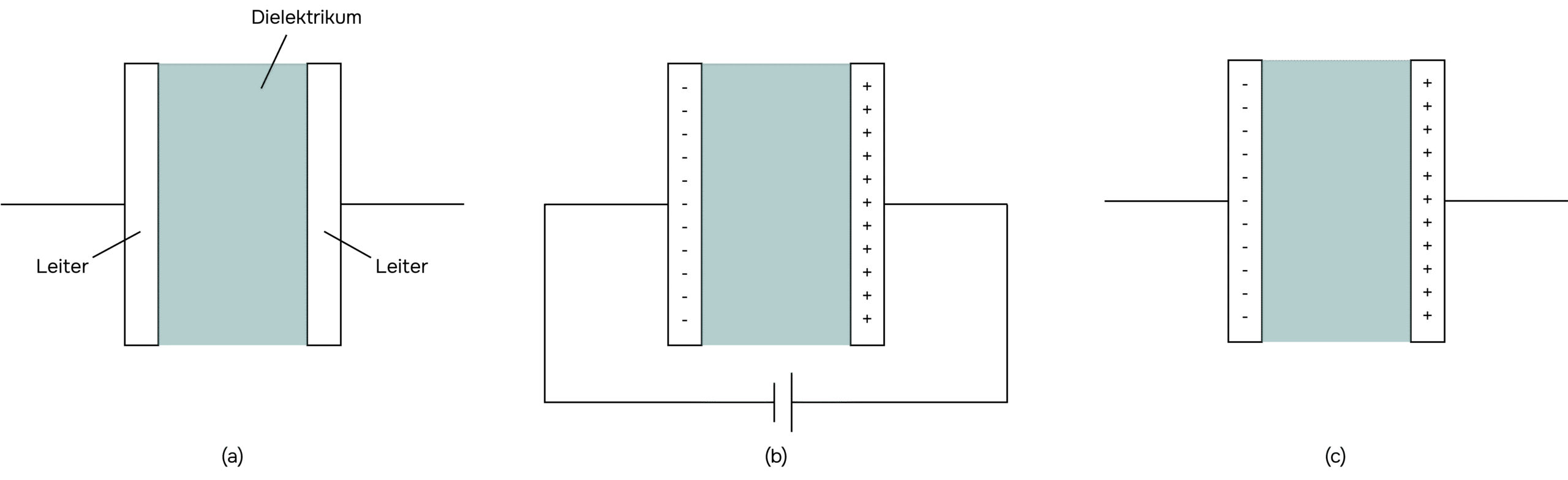 Um elektrische Ladung zu speichern, verwendet man Kondensatoren. Ein Kondensator besteht aus zwei Leitern (zum Beispiel in Form von Platten oder Stäben), die durch ein isolierendes Material – das Dielektrikum – voneinander getrennt sind (a). Legt man eine Spannung an die beiden Leiter an, fließen von einem Leiter Elektronen ab. Dieser Leiter lädt sich dadurch positiv auf. Gleichzeitig fließen Elektronen auf den anderen Leiter, wodurch dieser negativ geladen wird (b). Entfernt man die Spannungsquelle, ziehen sich die entgegengesetzten Ladungen auf den beiden Leitern an und bleiben erhalten – die Ladung ist somit gespeichert (c). Das Dielektrikum zwischen den Leitern beeinflusst, wie viel Ladung gespeichert werden kann. Diese Eigenschaft wird durch die Dielektrizitätskonstante beschrieben.